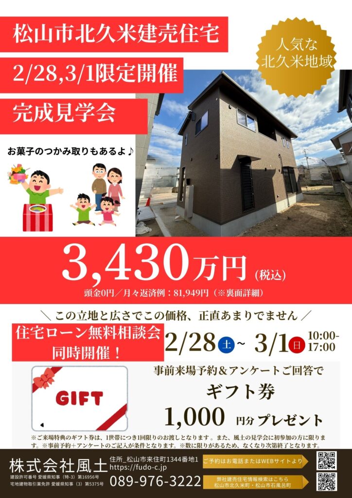 【北久米町】完成見学会開催!この立地と価格、実際に見てください|松山市の建売住宅